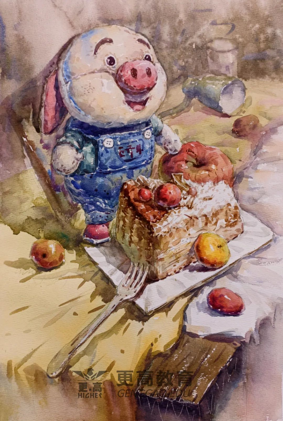 第四步:畫面關系繼續深入,把背景畫的桌布的顏色畫出來,把整張畫面的色調交代出來,所有的顏色要往畫面的主色調上去靠攏。視覺中心的細節繼續深入,把畫面的關系和層次畫的厚重一些。