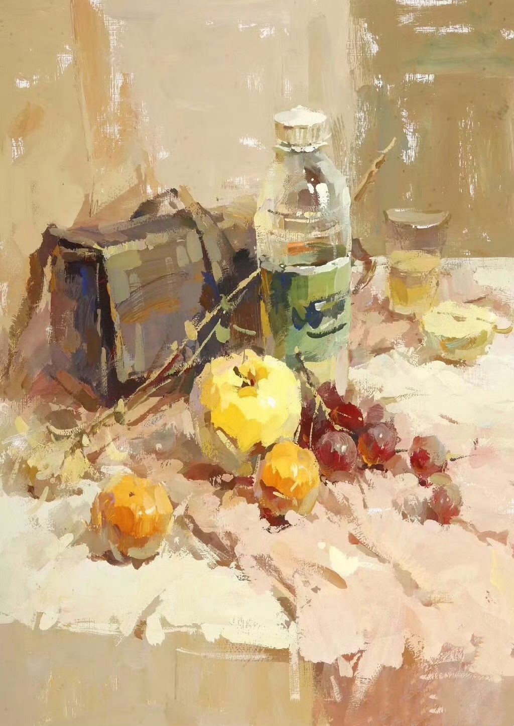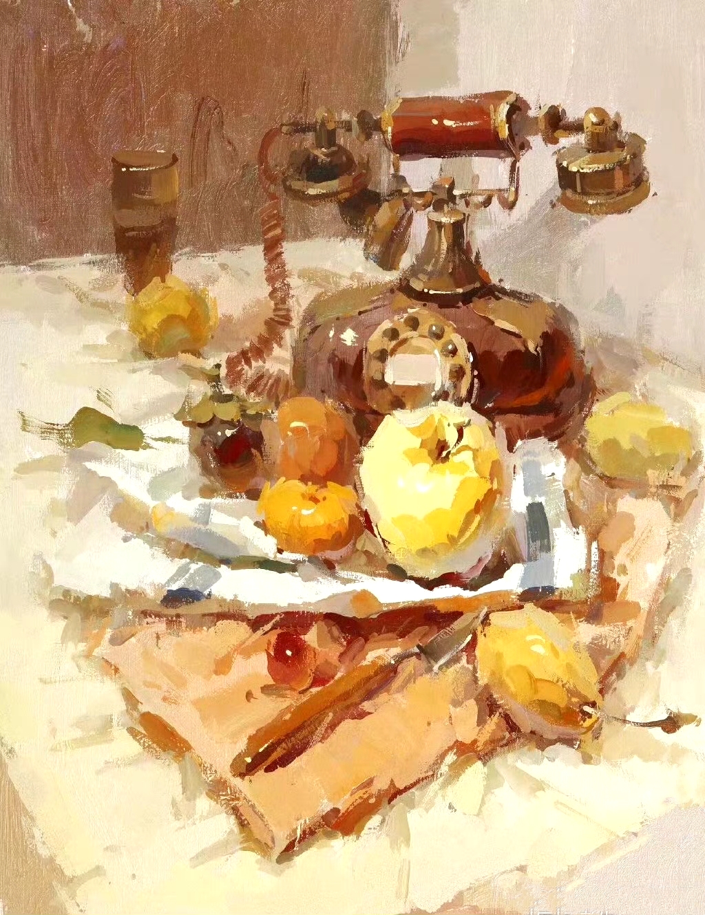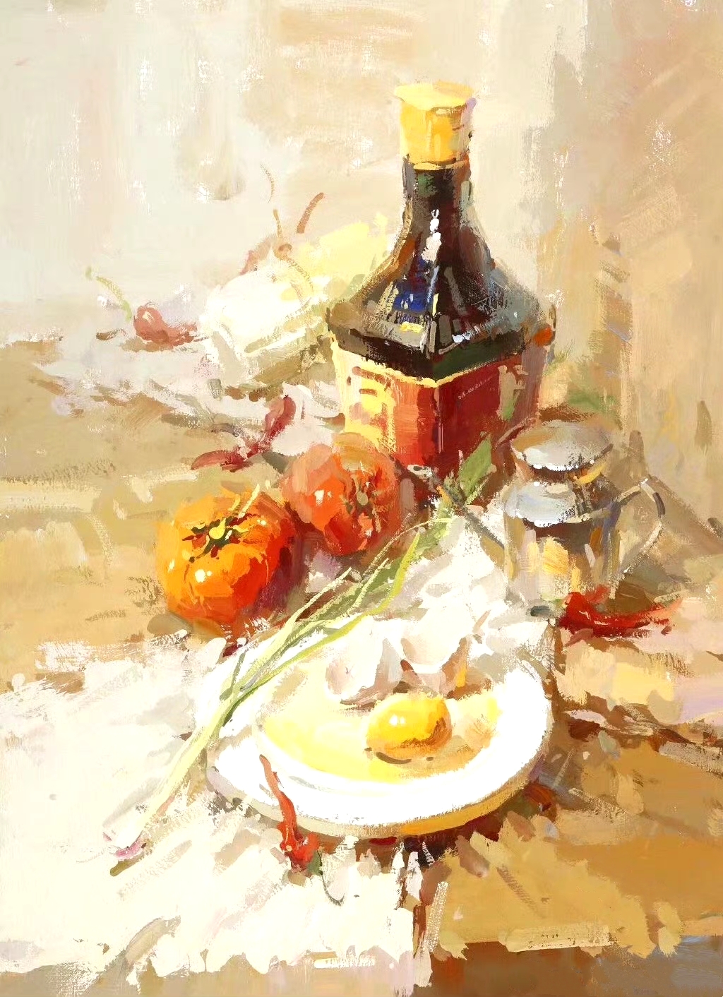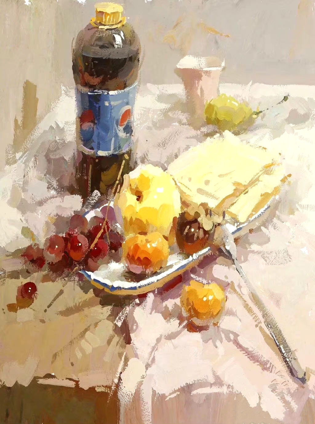 物體造型要結實,外輪廓要虛實結合,掃出去的顏色力量要小一些,不要太大面積。鋪色時畫好固有色和環境色,豐富反光的環境色要添加少許冷色掃上去。重的地方要卡一卡,要自然一些,不要太跳了。