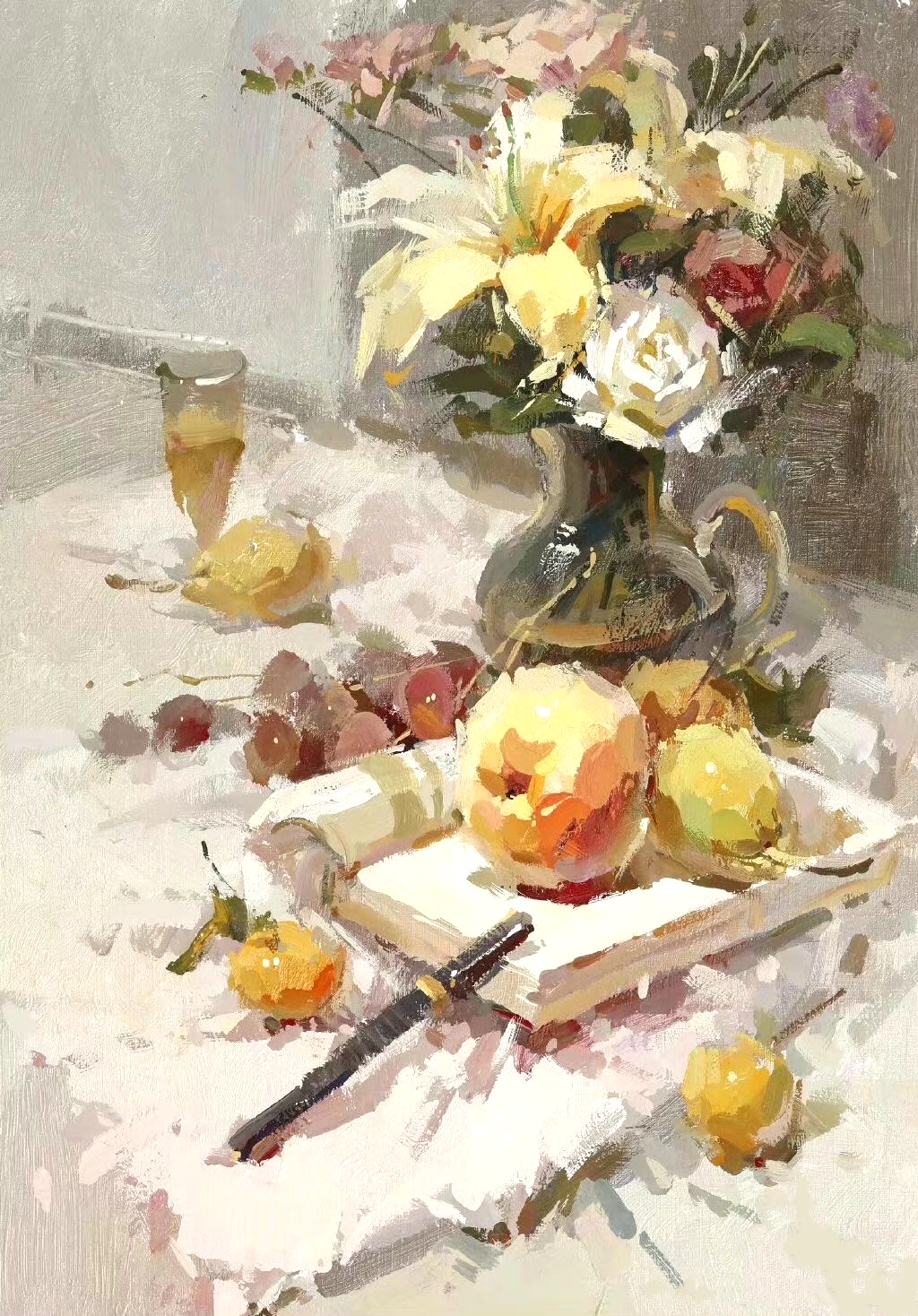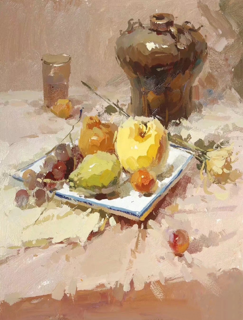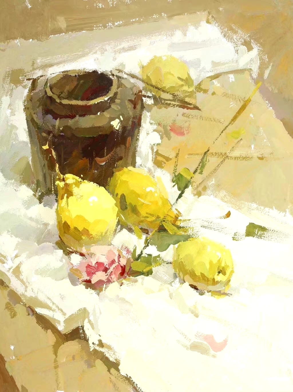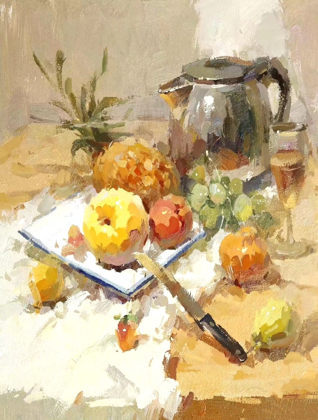物體造型要結實,外輪廓要虛實結合,掃出去的顏色力量要小一些,不要太大面積。鋪色時畫好固有色和環境色,豐富反光的環境色要添加少許冷色掃上去。重的地方要卡一卡,要自然一些,不要太跳了。